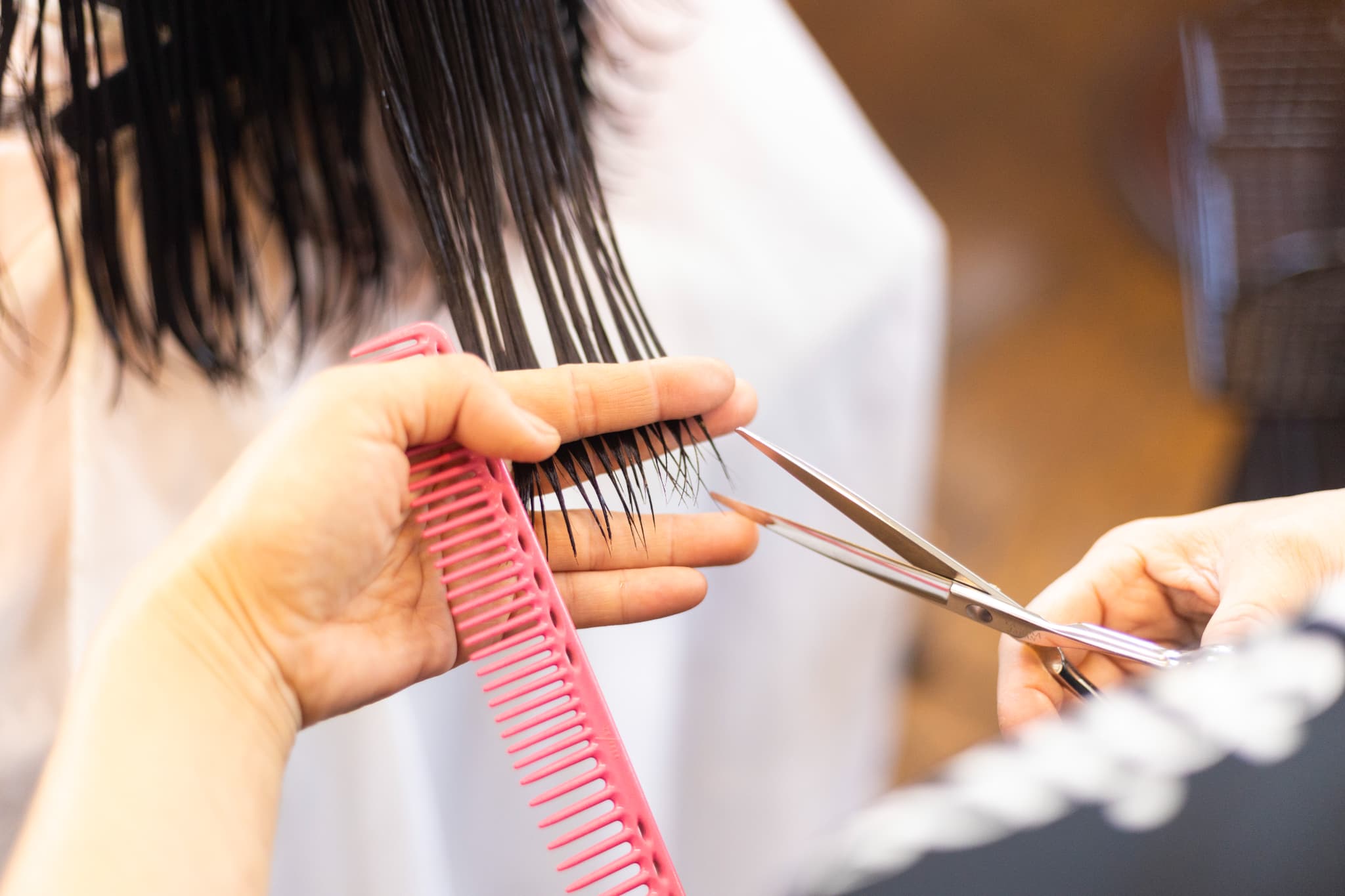 カットに入る前に、頭の丸み、ハチの張り、首の長さ、顔のバランスといった骨格を詳細に診断し、小顔に見える理想的なシルエットを創り出します。